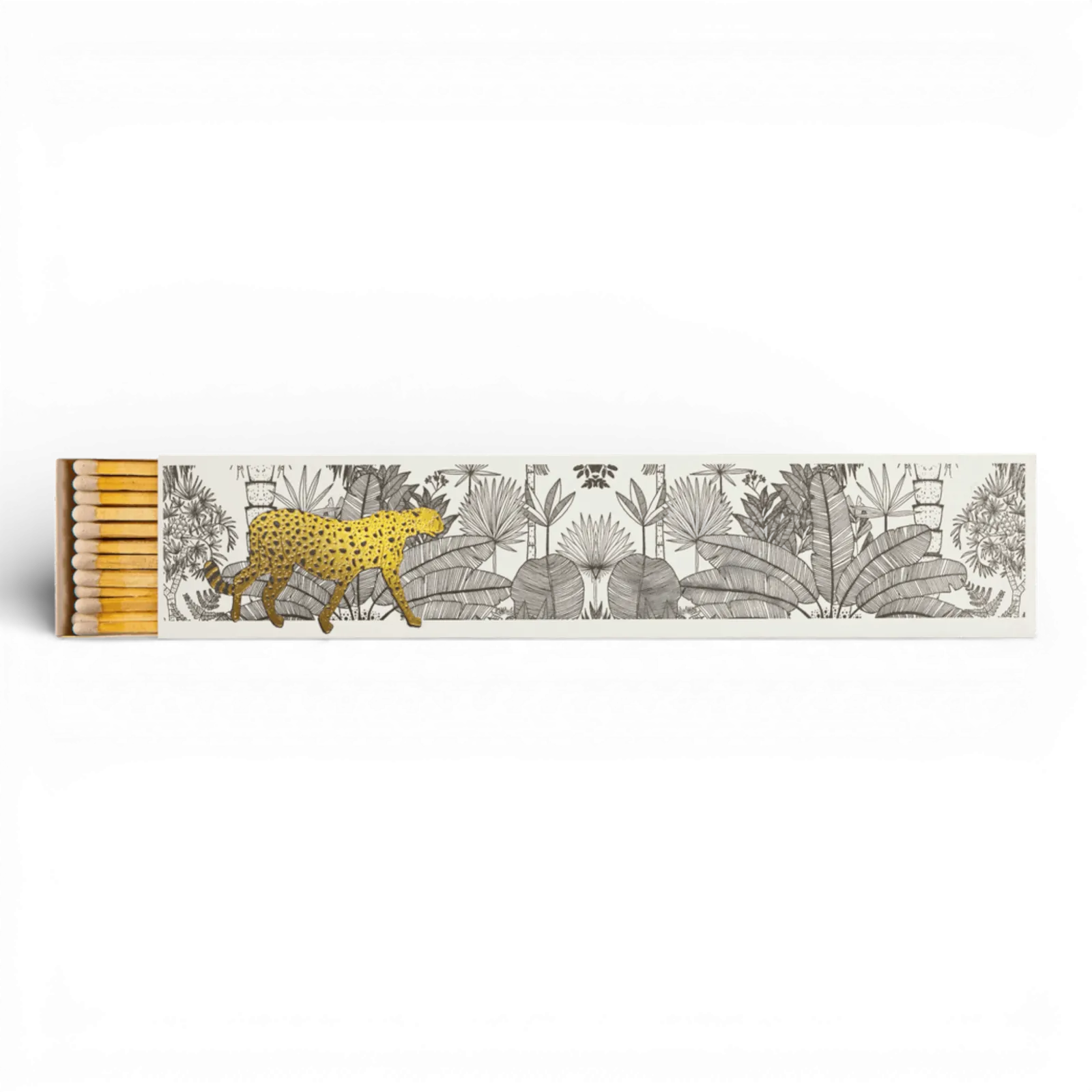 Our long matchbox featuring a gold cheetah prowling through the jungle.