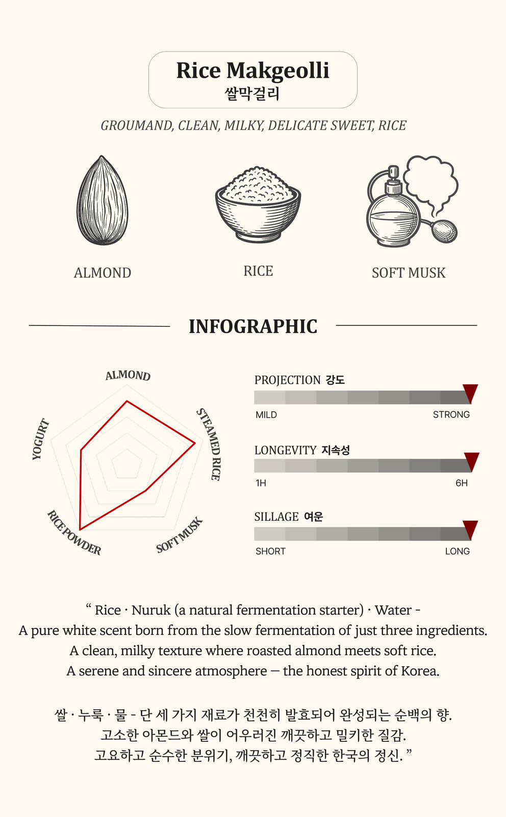 The scent begins with a soft, clean note of almond and warm rice. It slowly turns into a gentle, milky feeling, like yogurt and fine rice powder. Soft musk and a gentle touch of amber spread quietly in the background, creating the calm and pure mood of milky-white makgeolli.