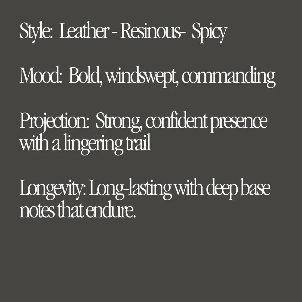 Sultry with a strong masculine tone of leather and Frankincense. This scent will take you to the roaring coast in Tasmania with a scotch in hand.