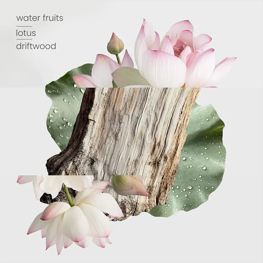 A serene and refreshing scent where delicate peony and water fruits open with a light, floral freshness. Lotus and iris unfold at the heart, lending a cool, airy elegance. The base of driftwood and soft musk adds calm and depth, capturing the essence of a tranquil garden retreat.